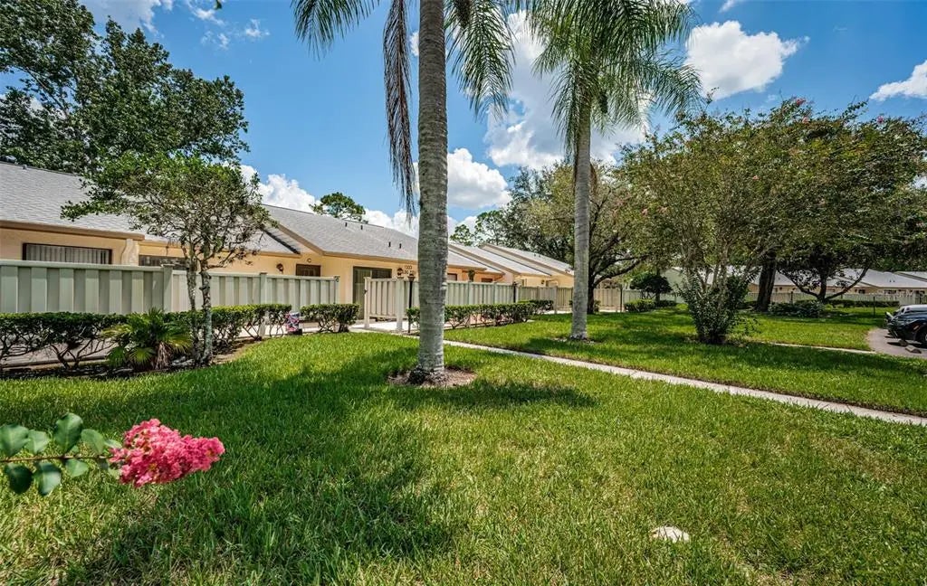 Nestled in desirable Deer Hollow in Pine Ridge at Lake Tarpon. No flooding or damage during Hurricanes! This villa offers 2 bedrooms and 2 bathrooms plus a family room (vented AC/heat, not in MLS) across the back of the villa. You enter onto an extra large fenced front patio that offers generous entertaining space with ultimate privacy. Step inside and you will notice the vaulted ceilings adding a sense of openness to the living area. The spacious eat-in kitchen is cheery and light with a stackable washer/dryer. The kitchen opens to the front patio for convenience. The spacious living and formal dining areas open to the family room that expands your living space. The back has a private view of the grounds. A split bedroom plan is ideal for privacy with the Primary suite on the back of the villa opens to the family room. The primary suite has a ensuite that has been remodeled and a walk-in closet. The guest bedroom and the remodeled guest bath are located on the front of the villa. You have assigned parking right in front of the villa with plenty of guest parking. Deer Hollow at Pine Ridge is a fantastic community that boasts a clubhouse, pool and spa, tennis courts and a playground. Your villa maintenance includes the exterior maintenance, grounds, trash and water. Located close to all amenities and the beaches! Ideal for a professional or as a second home!