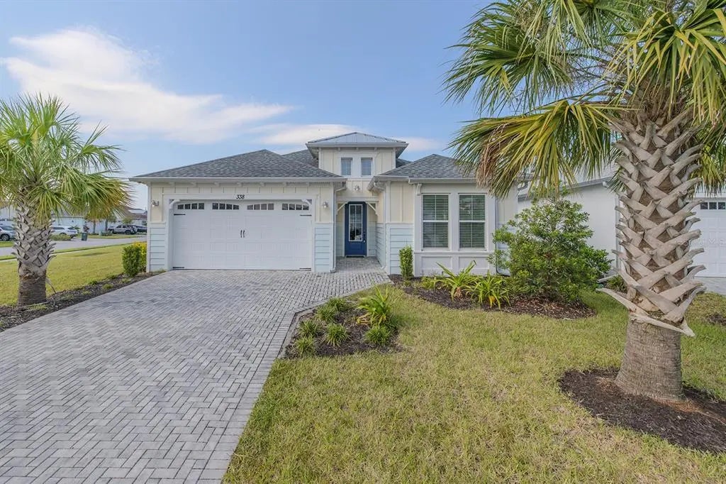 Furnished corner-lot Cabana Model—this spacious 3-bedroom, 2.5-bath home welcomes you with a substantial foyer leading to two front bedrooms and a formal dining space adorned with seamless tile throughout. You'll adore the brilliant white kitchen featuring stone countertops, a wine refrigerator, double wall ovens, and a walk-in pantry. The expansive primary bedroom offers two walk-in closets, a sitting area, and an ensuite spa-like bathroom with abundant cabinet space and a seamless glass walk-in rain shower. The lanai awaits your personal touch, complete with enough room and plumbing for a small pool. This development boasts its own shopping center with Publix, restaurants, a pet store, and more, all close to Tanger Outlet shopping. Fantastic amenities are just a golf cart ride away—including a Paradise Pool, Fitness Center, Wood Workshop, Bar & Chill Restaurant, Pickleball, Bocce Ball, Clayground, and more—and we have a brand new golf cart available to sell with the home!