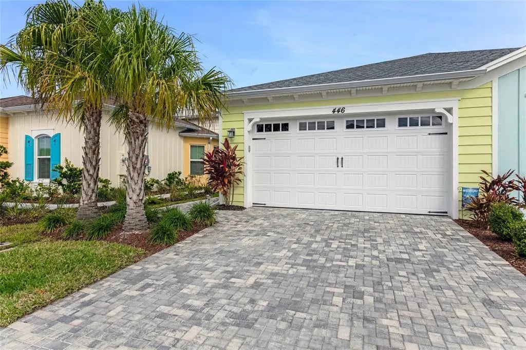 **Welcome to 446 Good Life Way in Latitude Margaritaville, Daytona Beach!** This beautifully upgraded 3-bedroom, 2-bathroom patio home offers stylish features and serene pond views from an extended lanai. Inside, enjoy 4” plantation shutters throughout, tray ceilings in the master bedroom and living room, and quartz countertops in the kitchen and bathrooms. The gourmet kitchen boasts all-white, soft-close cabinets with pull-outs, under-cabinet lighting, a full-height quartz backsplash, a gas stove, and KitchenAid appliances, plus a Whirlpool washer and dryer. The master suite includes a custom Closet by Design walk-in, and all closets feature wood shelving for a polished look. The third bedroom, with a closet and French doors, is ideal for guests or as a home office. Durable vinyl plank flooring runs throughout—no carpet! Outside, the spacious lanai includes a grand view screen, privacy roll-down shades, patio lighting, a gas grill hookup, and scenic pond views. Additional highlights include an automatic blind for lanai sliders, an epoxy-coated garage floor, tankless water heater, rough-in for a water softener, and utility sink in the garage. Latitude Margaritaville offers resort-style living with a fitness center, pools, on-site dining, and a complimentary shuttle service to the community’s private clubhouse in Ormond Beach, as well as to the beach.