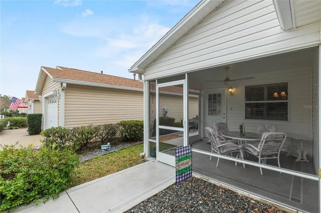 REDUCED $24,000! LOCATION, LOCATION, LOCATION! This Charming Colony Patio Villa is located in the VILLAGE of BELVEDERE. Easy access to the main road without going through a Maze of streets. LOCATED SOUTH of CR 466 corridor which is within minutes of the everyday convenience you could ever need from restaurant, shopping, banking, medical care (EMT), library pools, golf courses and LAKE SUMTER LANDING. TURNKEY - MOVE IN READY - NO BOND - NEW ROOF (March 2025) - HOT WATER HEATER (2022) - PLANTATION SHUTTERS - SOLAR TUBE SKYLIGHTS - SCREENED IN LANAI AND GARAGE. Relax sitting in your cozy, screened in Lanai sipping your morning coffee! Step inside this light, bright & open floor concept plan that welcomes you Home! Beautiful wood looking laminated floors accent the Living room, dining area and bedrooms (No Carpets!). Spacious LIVING ROOM has ceiling fan, leather sofa, end tables, TV, & entertainment center. Dining area has a dining Table w/6 Chairs and a beautiful glass Hutch. Living room & dining area has a sliding door that leads to the Patio & BBQ grill. KITCHEN features maple wood cabinets, pantry, breakfast bar, deep double sinks, and Stainless Steel refrigerator, microwave & dishwasher. Gourmet cooking on gas stove. The SOLAR TUBE brightens the kitchen adding natural light. The kitchen & bathrooms flooring are 16x16 Ceramic Tiles. PRIMARY EN-SUITE has a spacious walk in closet, Bedroom Set, TV, & more. - Spacious GUEST BEDROOM has a large closet. Hallway linen closet would be perfect for an owner's closet. Garage has a Sliding Screened Door. Decorative driveway, walkway and side patio highlights the front curb appeal and Low Maintenance landscaping! There are four guest parking spots nearby so you can have friends over without worrying about street parking! ENJOY the "Neighborhood Mingle" every Thursday, a fun & great way to meet your neighbors! This Villa is great as a seasonal home, investment property (long ot short term) or as YOUR home. The home is ready to move in with appliances, furniture, kitchenware and more! Inventory list can be provided. The KEY to this home is LOCATION and is in the HEART of The Villages. Just imagine yourself living your golden years in this charming home with w h i t e picket fence, "LOVIN' THE VILLAGES LIFESTYLE" with GOLF year round (slight fees may apply) and FREE NIGHTLY ENTERTAINMENT at ALL the TOWN Squares with Lake Sumter Landing only a minutes car ride away. FUN ACTIVITIES ALL YEAR LONG! Make your appointment today!