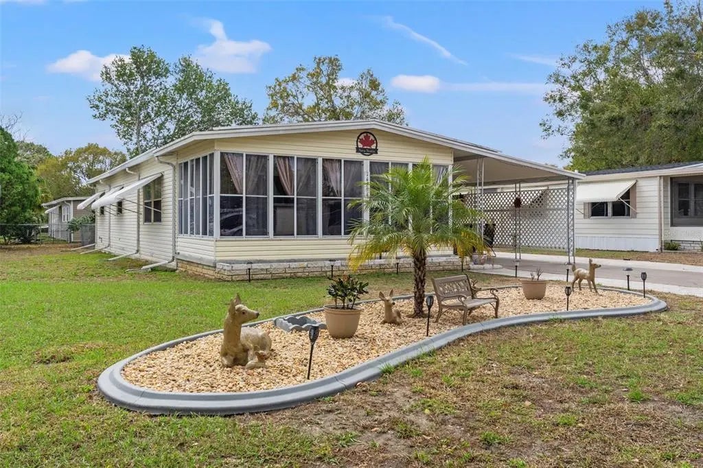 CASH ONLY – Updated double-wide manufactured home in the Brookridge 55+ gated community. Situated on a 6,000 sq. ft. lot, this 1,152 sq. ft. home offers 878 additional sq. ft. of porch and workshop space. The home features luxury vinyl plank flooring with ¾-inch plywood subfloors, updated kitchen cabinets and countertops, and a drywalled interior, including ceilings. The primary suite includes a walk-in closet, and both bathrooms have been updated. Outdoor features include a screened porch, a Florida room with screened windows, an irrigation system, and a fully fenced portion of the yard, with additional property extending beyond the fencing on both sides. The paver driveway extends an extra 8 feet, and there is a golf cart garage and workshop area. Additional upgrades include soundproof insulation between bedrooms and living spaces, vinyl siding, and a roof-over (2009). This home is being sold fully furnished (some exclusions apply). Located in a desirable golf course community with low HOA fees. Schedule your showing today!