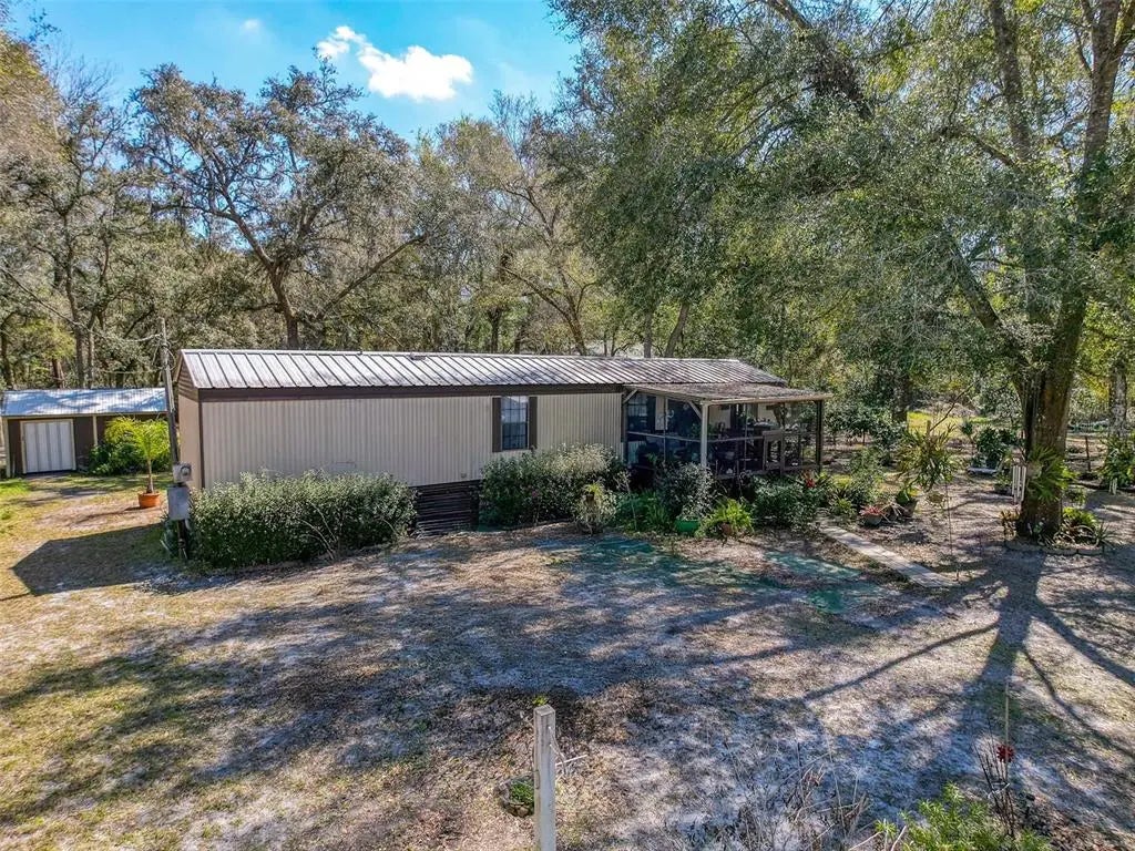 Peace, Privacy & Elbow Room, that's what you'll find at this cozy 2 bedroom getaway. Outside, the property is fully fenced, and extends 100' beyond the tree line out back to add a woodsy feel. A large storage shed/workshop makes a versatile spot for your hobbies. Open Deck on back and a Covered Deck out front. Metal roof! Inside, plank laminate flooring throughout with wood panelling and cabinets; plus the exposed beam ceiling adds a rustic feel. Breakfast bar overlooks the living space with lots of windows. The laundry area is inside, and washer/dryer are included. Smart bedroom layout gives privacy, and the bathroom is designed with effeciency in mind. All of this makes a move-in ready package for a snow bird or year-round resident!
