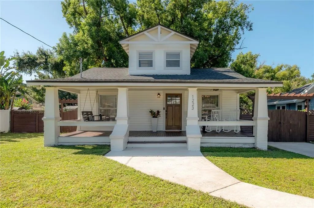Under contract-accepting backup offers. Welcome to The Chelsea Charmer, nestled into the heart of Southeast Seminole Heights. They just don’t build houses like this anymore. Built in the 1950s, the Chelsea Charmer is the kind of bungalow that makes you slow down as you drive by and admire how darling the house is, and you wonder to yourself what it looks like inside. With its 224 sqft front porch and freshly painted exterior, it looks every bit the storybook home you imagine when you think of sipping sweet tea on a warm southern afternoon. Step inside and feel the charm wrap around you like a warm hug—because that’s exactly what coming home should feel like. Throughout the home, original hardwood floors in a warm, rich deep-brown set the tone, complemented by new light fixtures, newly painted interior, and a brand-new 6-lite wood front door that adds just the right touch of character. The kitchen blends timeless style with modern convenience: granite countertops, white shaker cabinets, subway tile backsplash, and stainless steel appliances (including a slide-in range and brand-new microwave). Off the kitchen, a spacious laundry/mud room connects directly to the back deck, creating a natural flow between daily life and outdoor living. There are three bedrooms and one bathroom, each space full of character and possibilities. The primary bedroom connects to the Jack-and-Jill style bath, while the second bedroom at the back is cozy in size but big on potential—ideal for a nursery, home office, reading nook, art studio, playroom, or even a future second bathroom. Upstairs, the oversized third bedroom feels like its own private hideaway, complete with space for a desk nook or cozy reading corner. At the front of the home, the dining room—with its own closet—could just as easily serve as a fourth bedroom or flex space if you prefer. Out back, this home continues to charm you with an oversized quarter-acre lot. A large deck wraps around a majestic oak tree, creating the perfect backdrop for dinner parties, quiet mornings, or little ones playing under its shade. A storage shed adds practicality, while the yard offers space to garden, entertain, or dream up future projects. And because a historic home is even sweeter with peace of mind, you’ll love knowing it has a new roof, new hot water heater, and updated plumbing and electrical systems. The Chelsea Charmer isn’t just a house—it’s a feeling. A little slice of Seminole Heights history where cozy charm meets modern comfort, waiting for you to write its next chapter. Make this your new Seminole Heights home!